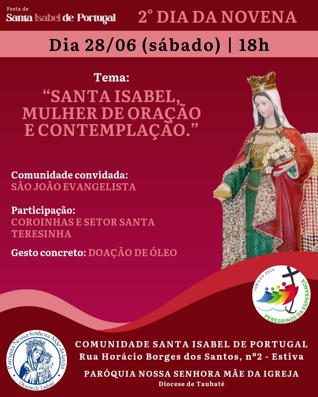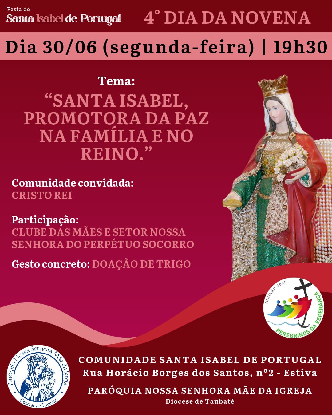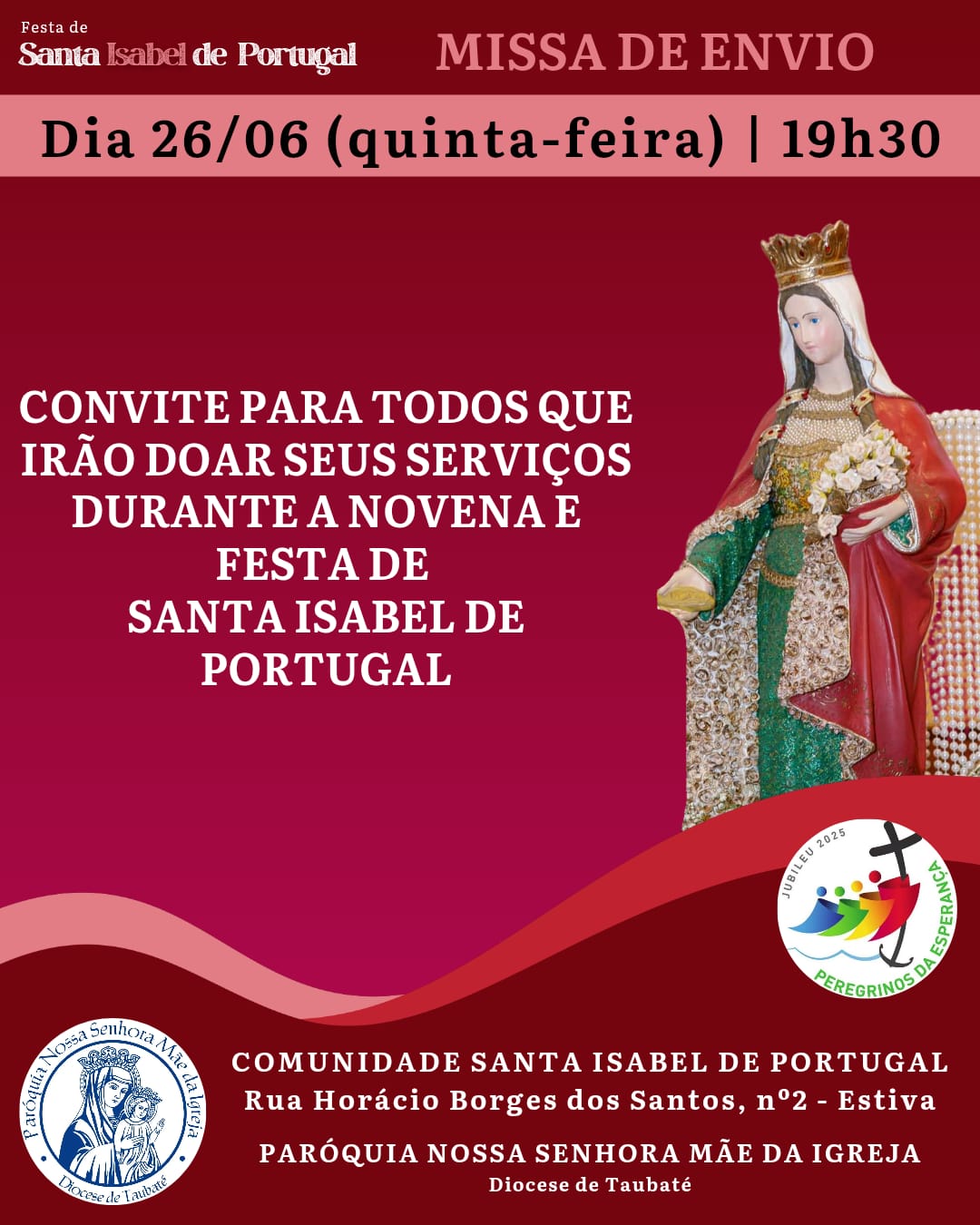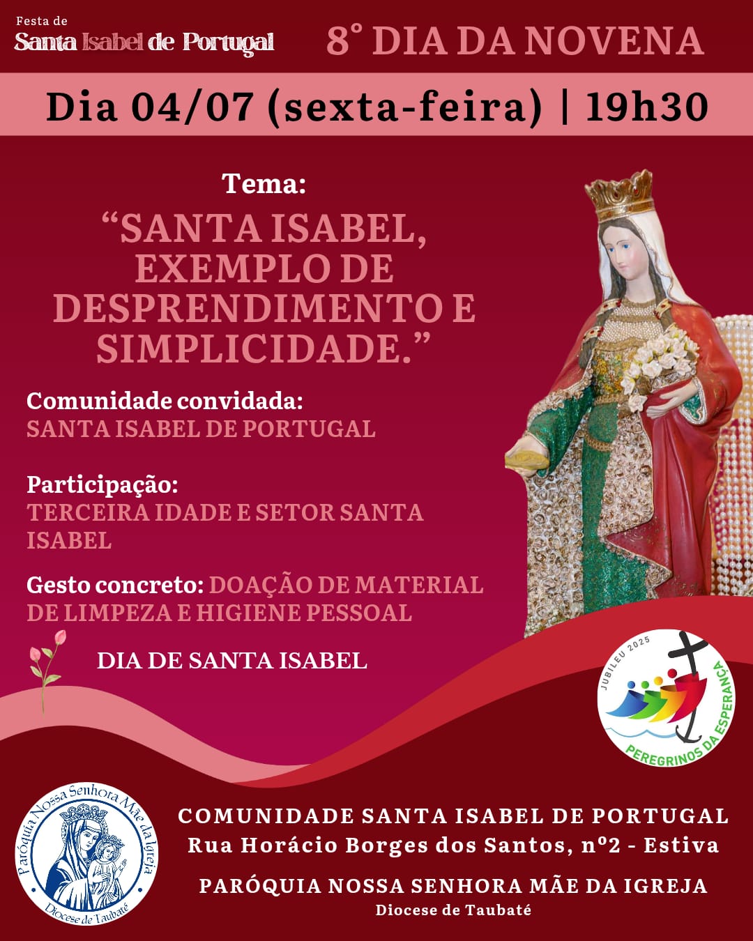 Início / Nossa Paróquia / PROGRAMAÇÃO NOVENA E FESTA COM. STA. ISABEL DE PORTUGAL